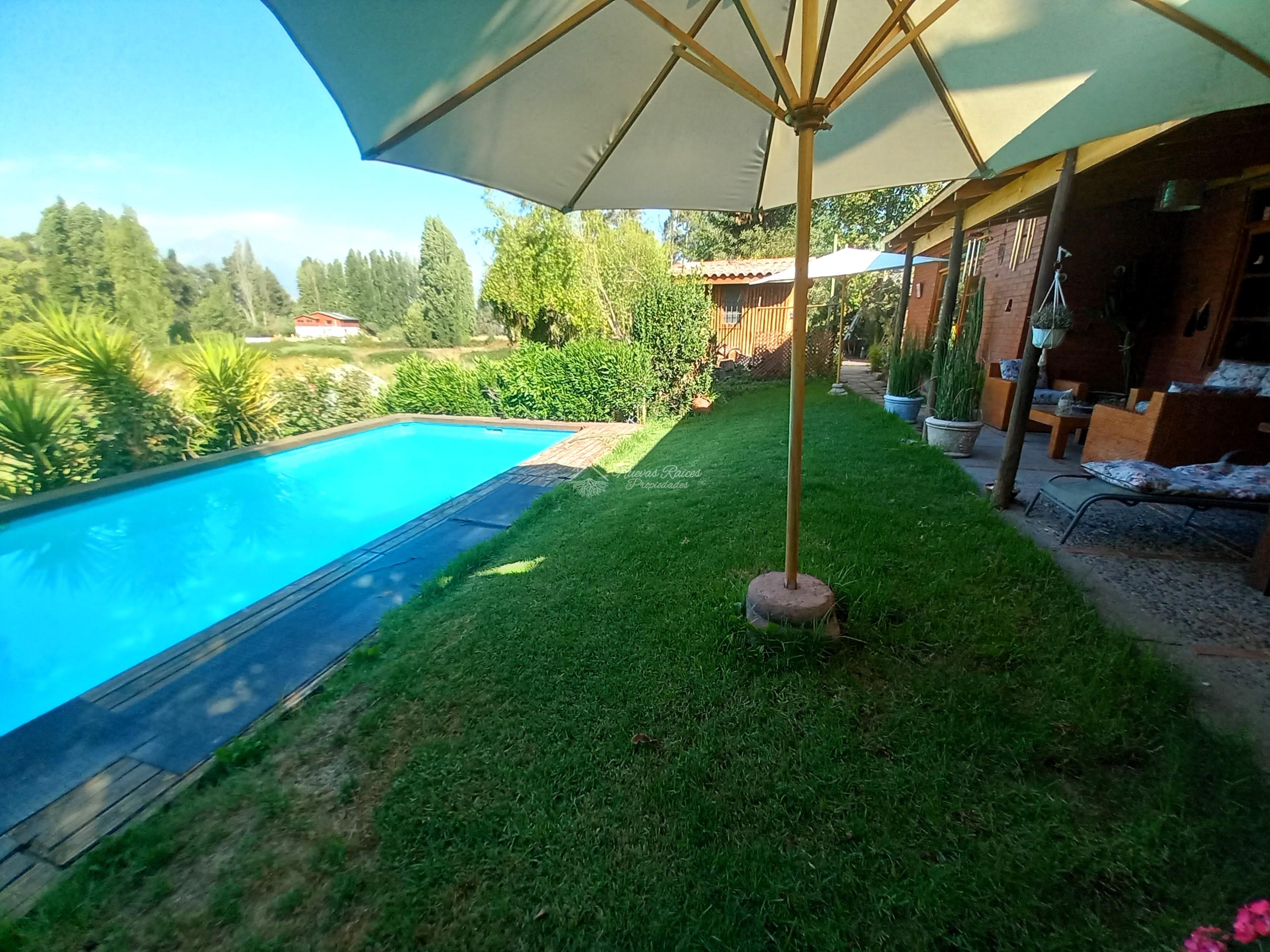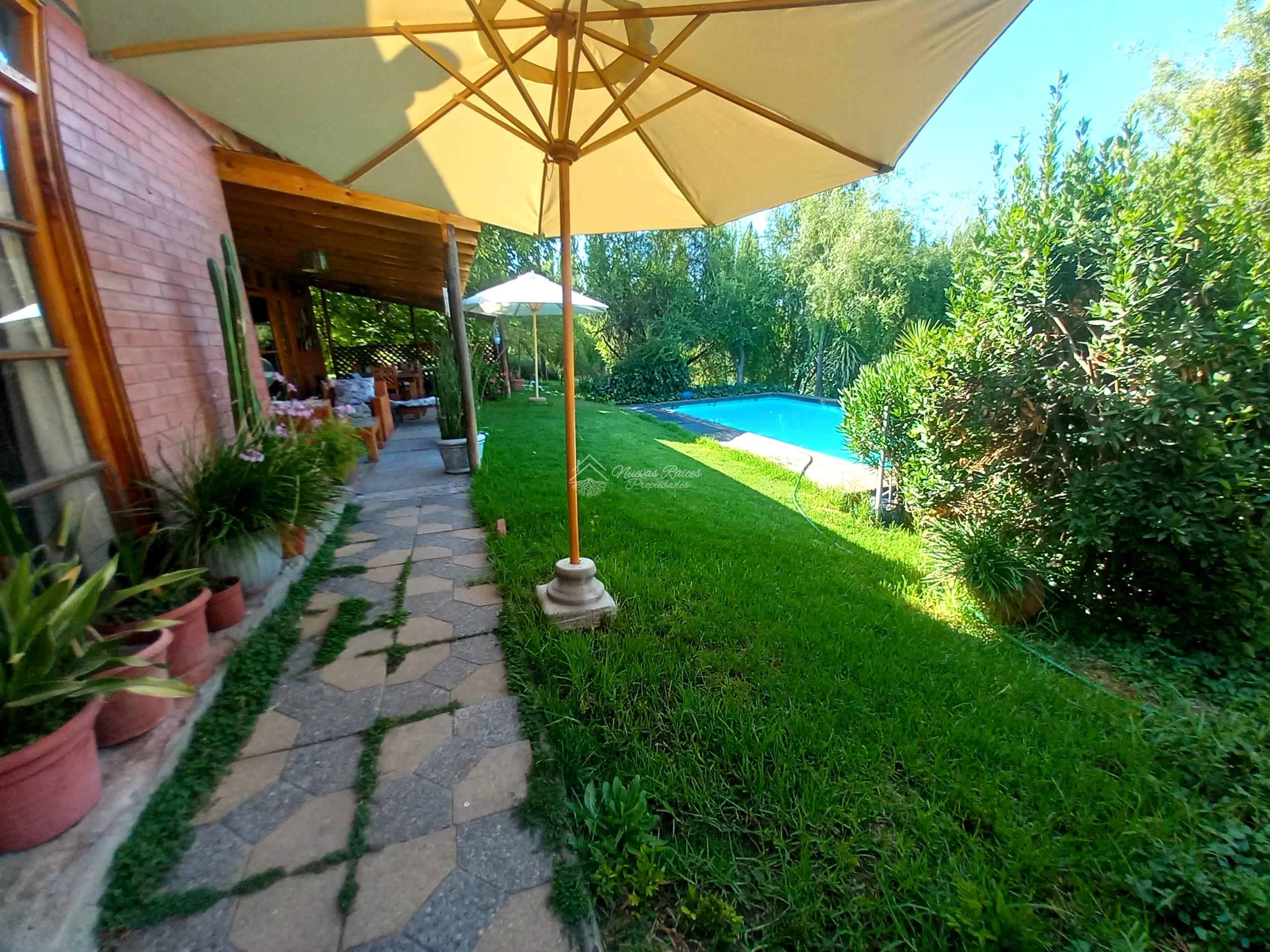 Terreno en por lo menos tres niveles de alturas, en el acceso llegamos al primer nivel con su imponente casa principal, rodeada de jardines con árboles frutales y ornamentales y por el otro costado tenemos la piscina que destaca la vista al valle de Pirque gracias a su particular ubicación.
